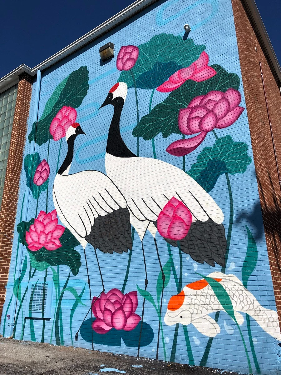 “The Lovers” Mural by artist Kimchi Juice, AKA Julia Chon, is located on the right sidewall of the Waynesboro Family YMCA. This mural was created as part of the 2020 VA Street Arts Festival, and it features a pair of cranes with a background of lotus flowers. This mural was done on the tallest wall the artist had tackled at the time of its completion.