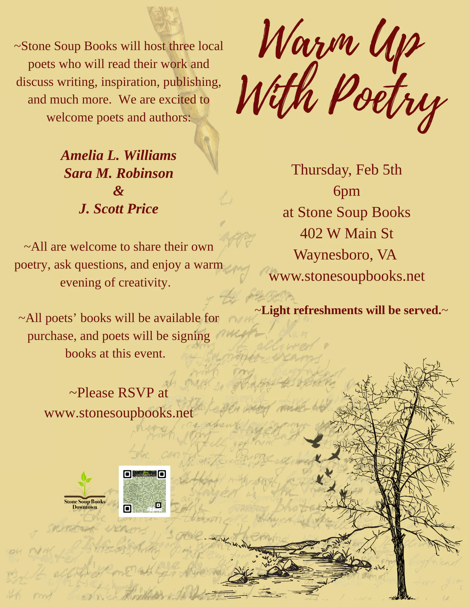 Three local authors will be reading their poetry, discussing writing, inspirations, publishing, and much more. All are welcome to share their own poetry, ask questions and enjoy a warm evening of creativity.
